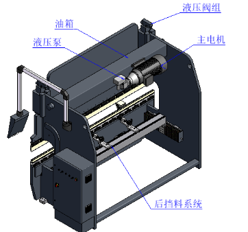 電液伺服液壓折彎機主要由床身、控制系統(tǒng)、液壓系統(tǒng)、后擋料系統(tǒng)、模具及補償機構(gòu)等部分組成,運動方式為上動式(液壓驅(qū)動系統(tǒng)在上面,驅(qū)動滑塊上下運動,工作臺不動),其結(jié)構(gòu)復(fù)雜、精度高,設(shè)備安全方面采用了雙重保護。