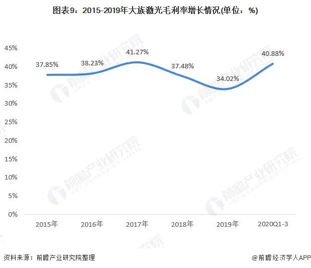 2015-2019年大族激光毛利率整體在35%以上水平,2019年略有下降,主要是受產(chǎn)品銷售結(jié)構(gòu)及市場競爭加劇的影響,導致公司綜合毛利率較2018年度下降約3.46個百分點;但是2020年前三季度上升為40.88%。