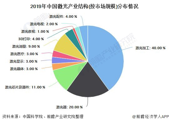 從激光產(chǎn)業(yè)的結(jié)構(gòu)看,2019年激光加工版塊大幅領(lǐng)先,占比40%;其次為激光器,占比20% (來源:前瞻產(chǎn)業(yè)研究院)