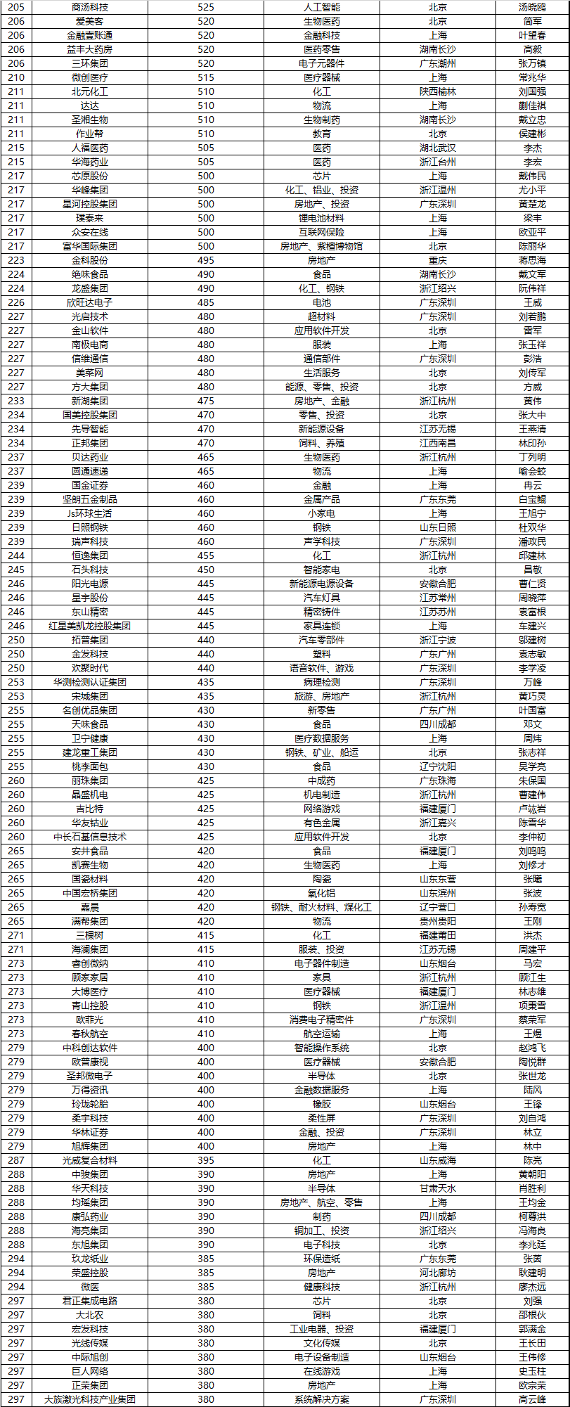 500強民營企業去年銷售額總和22萬億元,是去年中國GDP的五分之一,超過英國一年的GDP;共擁有員工970萬人。胡潤表示:“要上中國500強榜單并不容易,今年門檻比去年高了90億元,達到230億元,但仍然有120家企業新上榜,500強的平均價值比去年增長了55%,達到1100億元。上榜企業在各個領域已經達到世界級。”