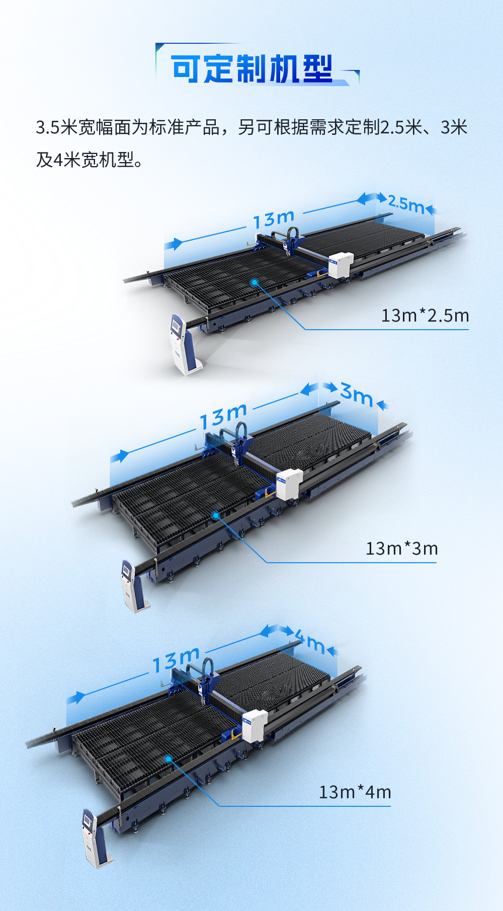 大幅面鋼結構專用光纖激光切割機,一體化線軌底座,行程大余量設計,配備自適應橫梁高精度加工,模塊化設計,超快交付。